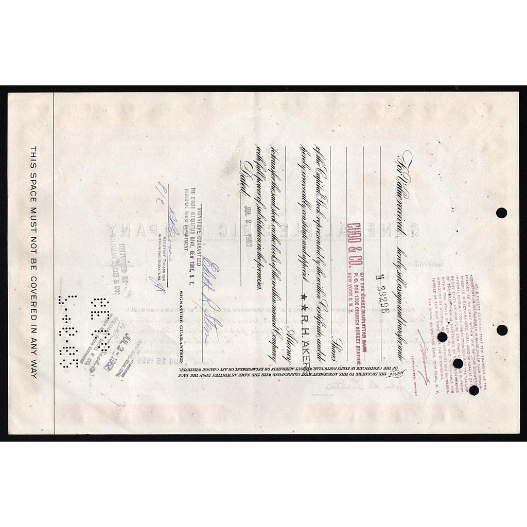 Dated Aug 25, 1969, for 100 shares, incorporated under the laws of the State of New York. Issued and punch cancelled, certificate is in good condition, with fold marks, slight edgewear, and a few pin/staple holes. 20 x 30 cm.