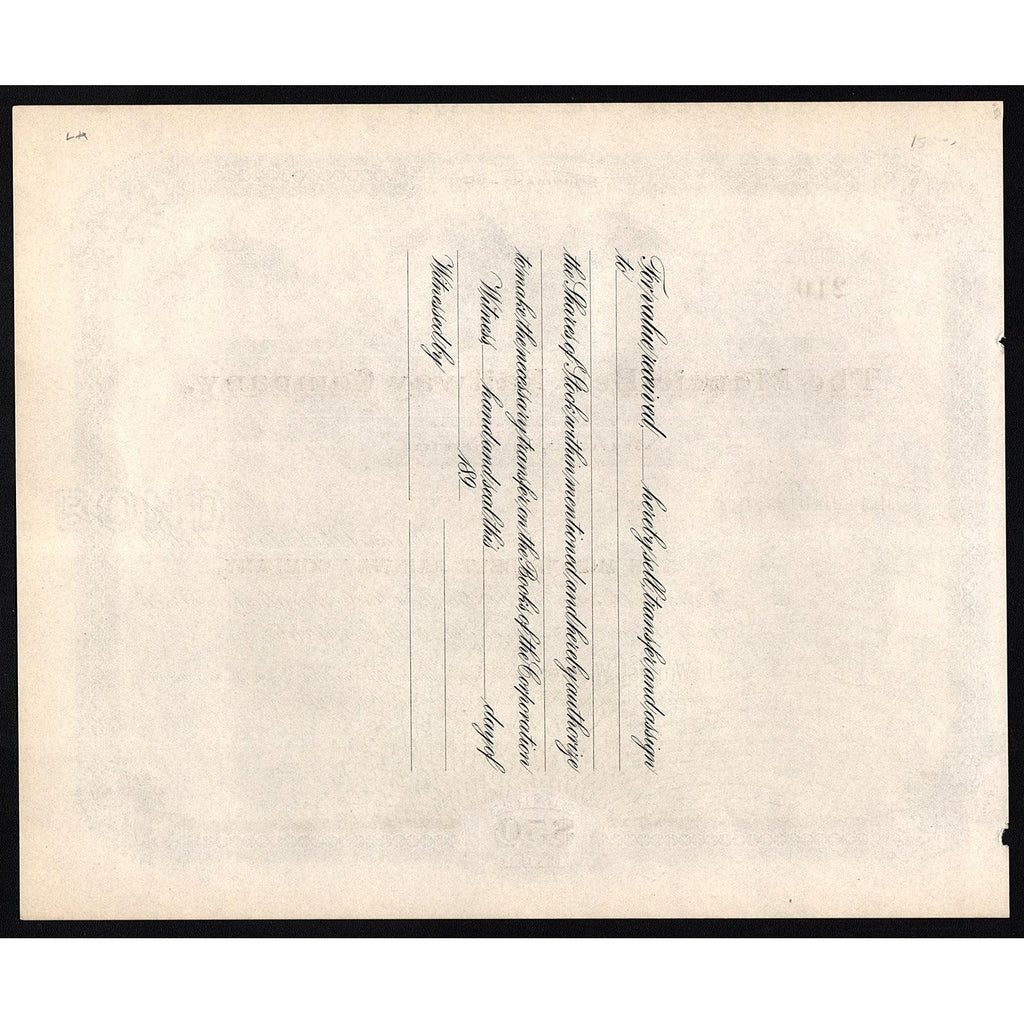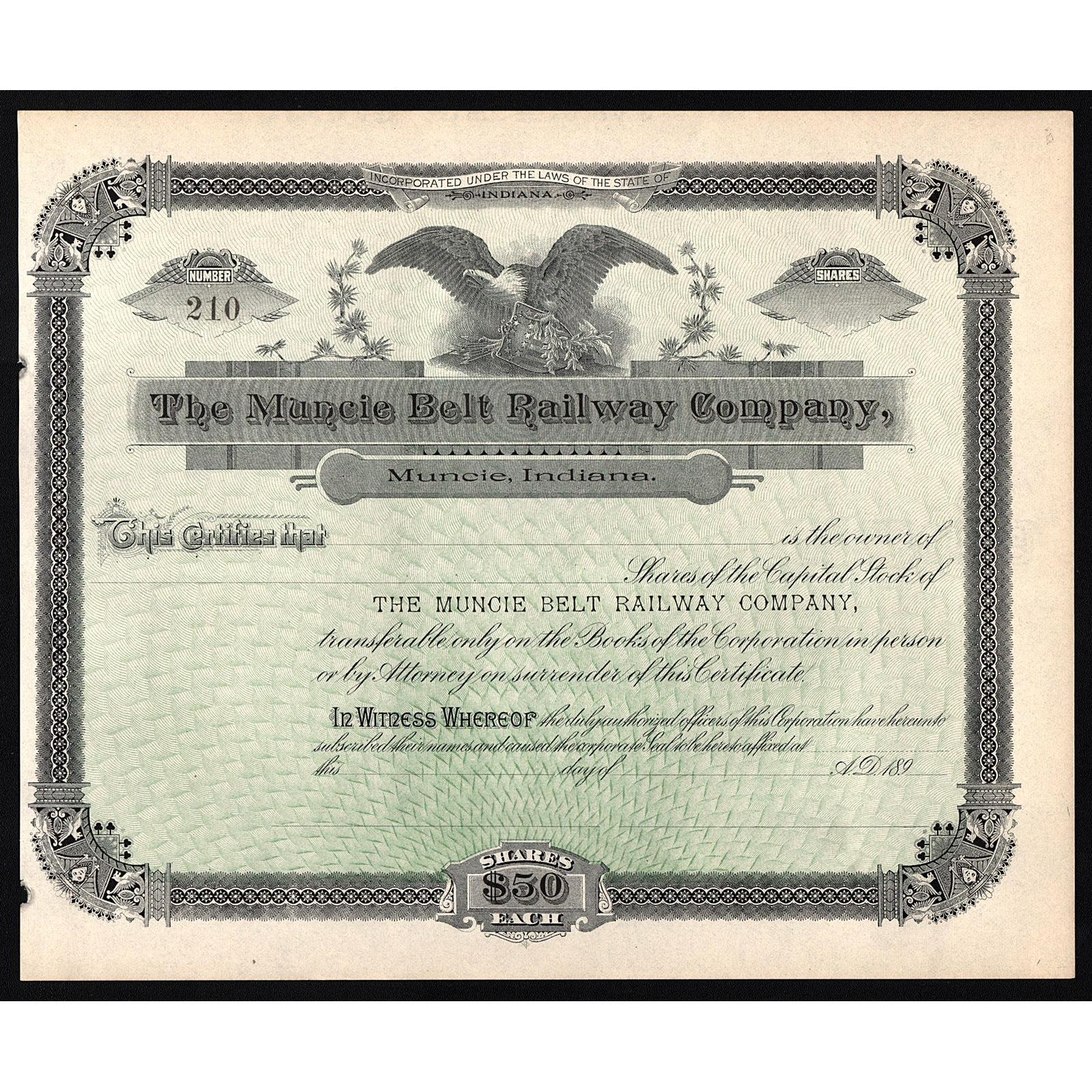 Dated 189_, No. 210, incorporated under the laws of the State of Indiana. Unissued and uncancelled, certificate is in good condition, with two small chips to the left margin. 21 x 25 cm.